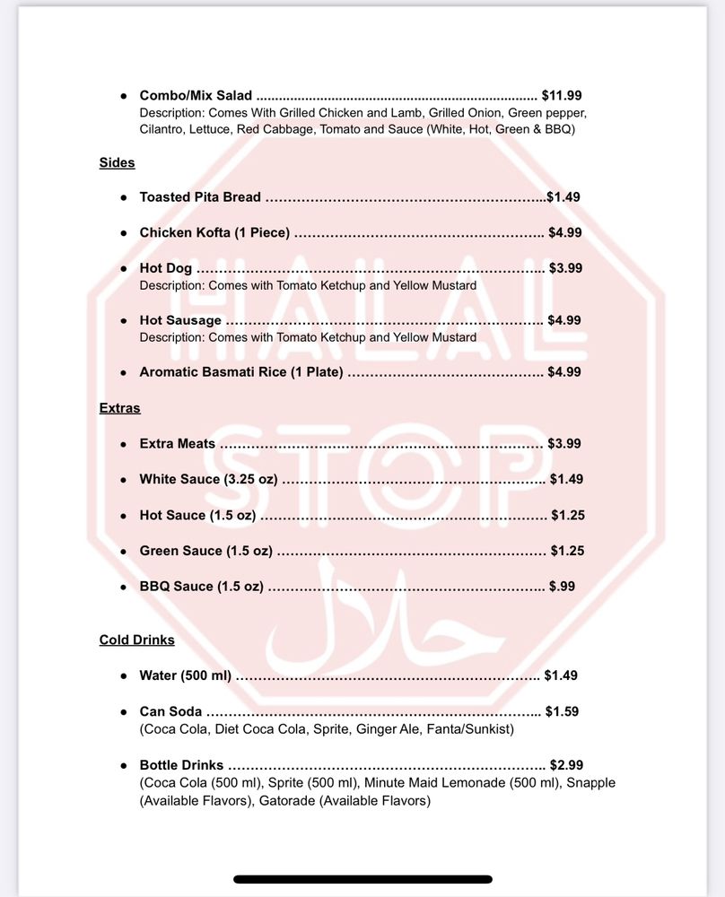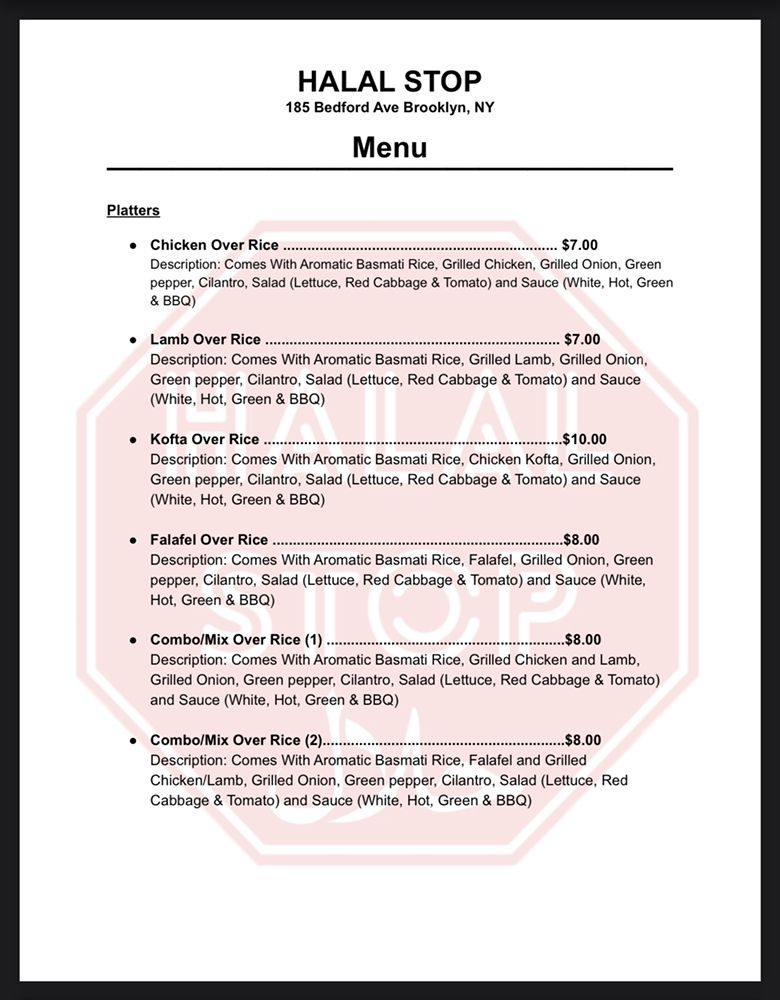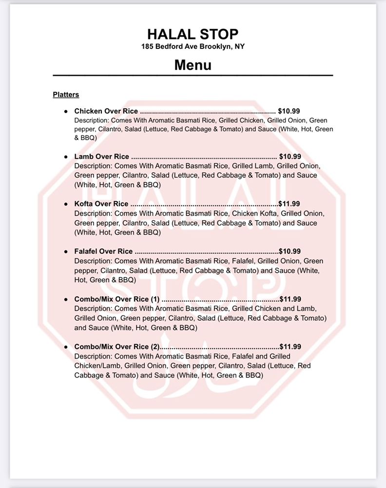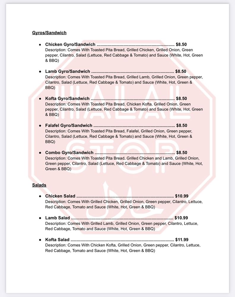 Welcome to Halal Stop, a vibrant food truck nestled at 185 Bedford Ave, Brooklyn. This halal haven specializes in savory sandwiches and wraps, with standout options like the Falafel Gyro and Combo Gyro. Each dish features freshly toasted pita cradling succulent proteins and crisp veggies, complemented by your choice of signature sauces. The Combo/Mix Salad is another highlight, marrying robust flavors with fresh ingredients for a delightful experience.